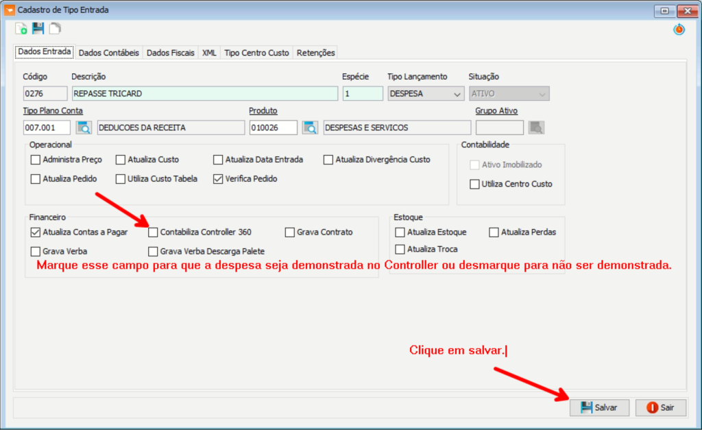 Marcar/Desmarcar despesa que será demonstrada no Controller #
