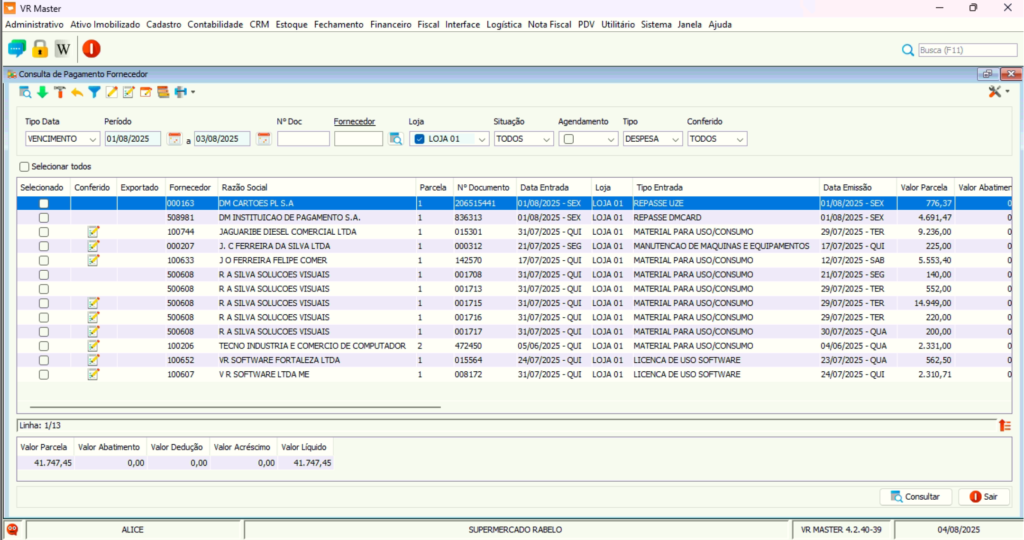 Acesse o VR Master: Financeiro / Contas a Pagar / Fornecedor (Tipo Data: Vencimento / Situação: Todos / Tipo: Despesa)