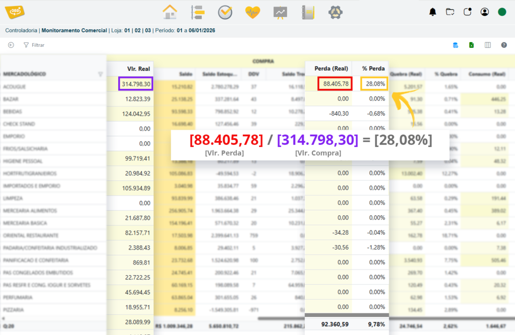 Fórmula: [Vlr. Perda] / [Vlr. Compra] = [% Perda]