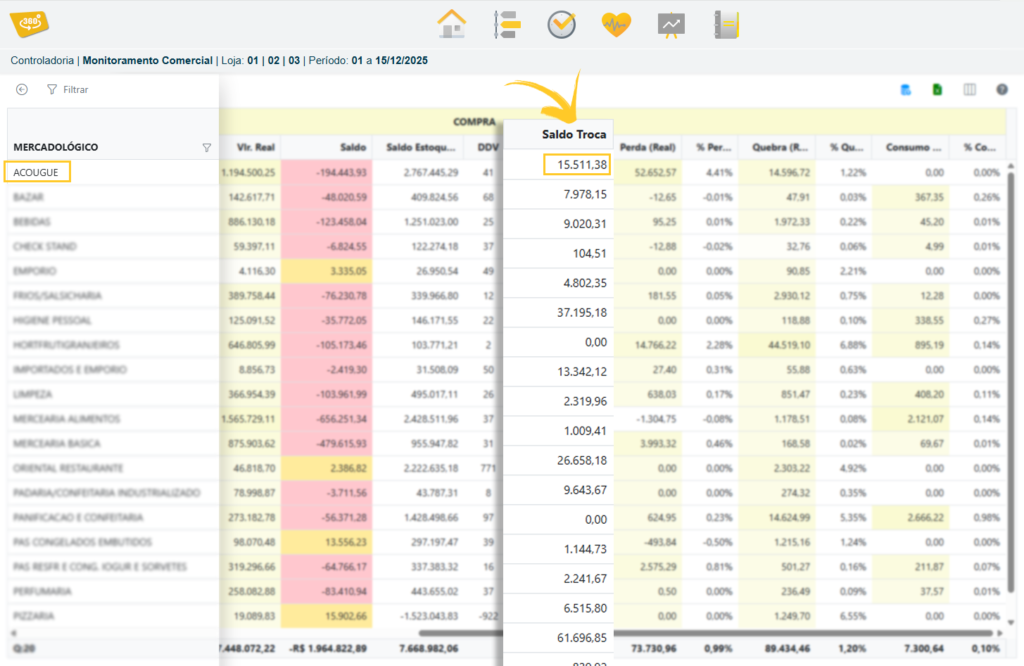 Controladoria / Monitoramento Comercial / Filtro/ Exibir Detalhes / Coluna Saldo Troca